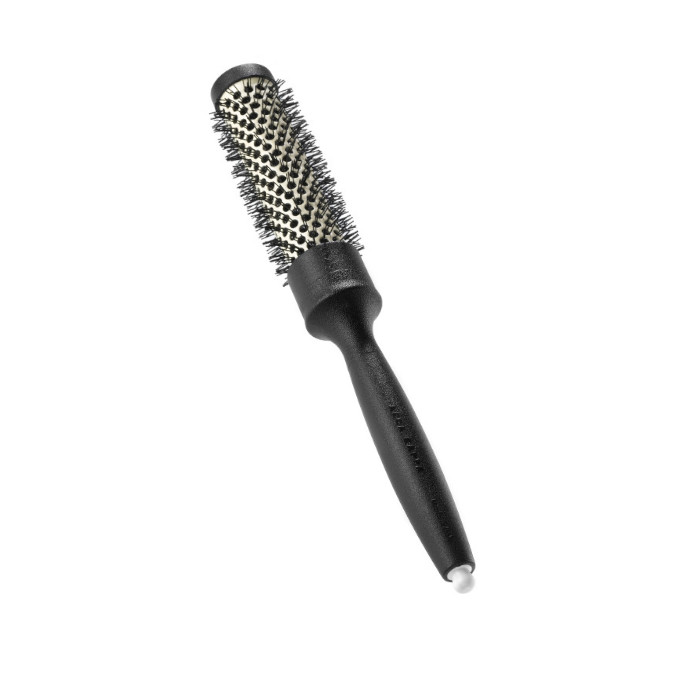Manico ergonomico e leggero realizzato con uno specifico materiale a base di “fibra di carbonio”. Ghiera in alluminio rivestita con ceramica e tourmaline. Setole in nylon resistente al phon con punte arrotondate. Punta estraibile per la divisione delle ciocche. La nuova impugnatura antiscivolo dal design ergonomico consente un perfetto controllo nei movimenti di rotazione della spazzola. La ghiera in alluminio è rivestita con uno speciale “mix” di ceramica e tourmaline che mantiene costante e uniforme il calore del phon. Quando viene riscaldata dal getto d’aria, la tourmaline diventa una fonte naturale di ioni negativi che neutralizzano la carica elettrostatica presente nei capelli. Gli ioni negativi trasformano le molecole d’acqua in micro particelle che penetrano all’interno del capello idratandolo. Le cuticole si chiudono perfettamente, rendendo i capelli morbidi e setosi. La tourmaline inoltre è una fonte di raggi infrarossi che penetrano nel capello velocizzando l’asciugatura senza danneggiare la struttura.