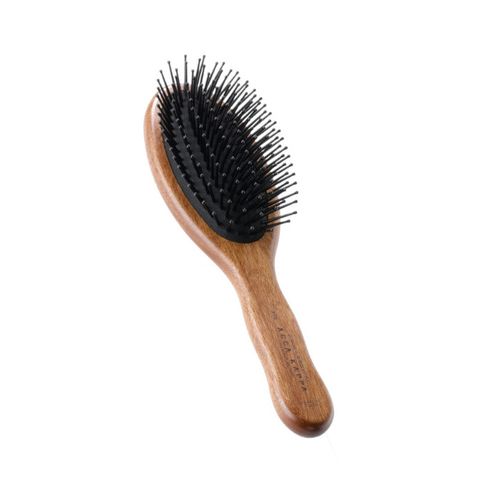 Spazzola con manico ergonomico in legno di Mogano Kotibè. Cuscinetto in gomma naturale nera, con spilli in materiale plastico resistenti al calore del phon e punte arrotondate per non danneggiare capelli e cuoio capelluto. Ideale per tutti i tipi di capelli, districa agevolmente anche le chiome più folte. Perfetta per l'asciugatura a phon dei capelli lunghi e dritti, li disciplina dalle radici alle punte e li rende luminosi. Utile per un massaggio stimolante del cuoio capelluto, anche per capelli corti. Lunghezza 22 cm