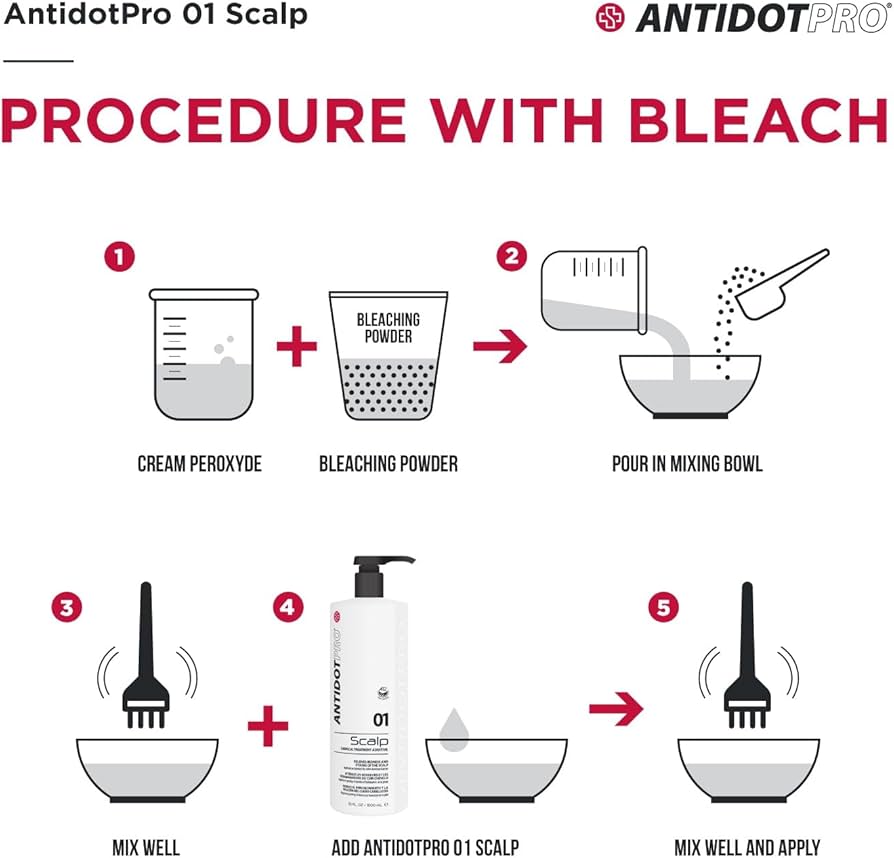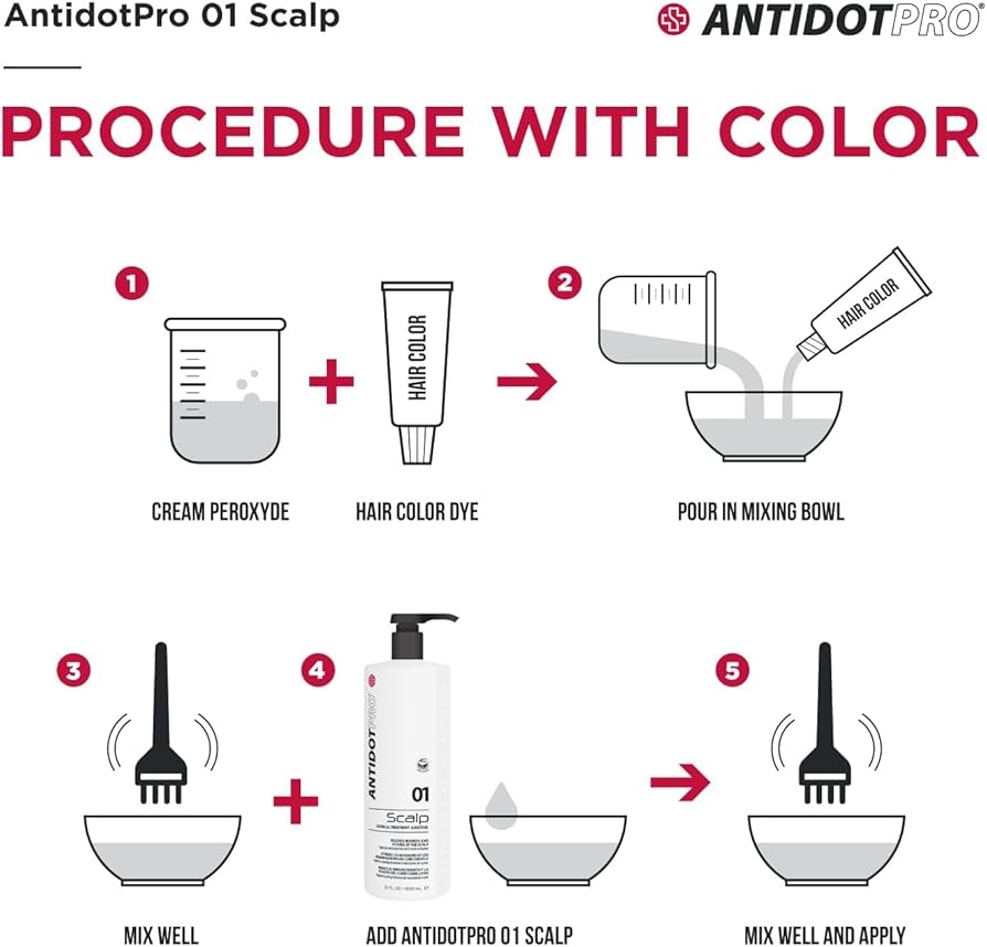 MODO D' USO: Aggiungere AntidotPro 01 Scalp a qualsiasi colore per capelli,decolorante.permanente e stiratura. Miscelare bene. Applicare secondo le procedure abituali. IL rapporto consigliato è di 1 a 6 se in presenza di cute normale, mentre in caso di estrema sensibilità il rapporto è di 1 a 4. Fare riferimento alle seguente tabella di mischelazione.