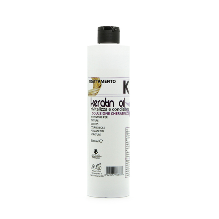 Trattamento multiuso a base di cheratina, puo' essere utilizzato come additivo per trattamenti chimici e lavori tecnici tinture, decolorazioni, colpi di sole, stirature, permanenti e mèches, come impacco ristrutturante con risciacquo e come protettivo effetto bagnato senza risciacquo.