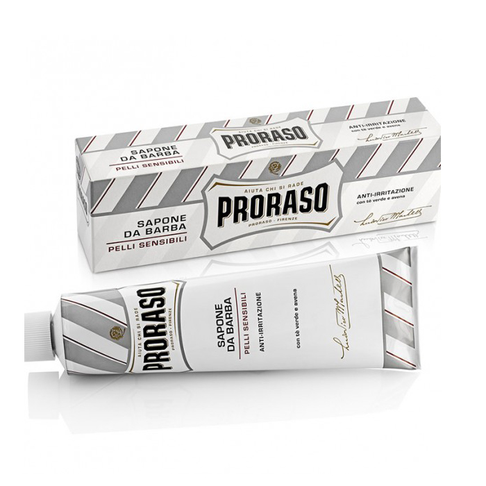 Proraso ha concepito una linea di prodotti dedicati al culto della rasatura che rispondono alle specifiche esigenze della pelle:linea bianca proraso, indicata per chi ha una pelle delicata che tende a irritarsi,lascia la pelle morbida e protetta, esaltando il piacere della rasatura.Sapone da barba: un grande classico della rasatura, che grazie alla sua consistenza estremamente ricca e cremosa protegge la pelle come uno scudo invisibile, evitando fastidiosi arrossamenti.Estratto di avena: ha effetto emoliente e lenitivo, rispetta il phdella pelle. Te' verde: antiossidante naturale ricco di polifenoli e minerali. Estratti di timo: antibatterico naturale, previene le irritazioni post rasatura. Tutto il piacere di una rasatura facile e veloce, senza traumi per la pelle sensibile.